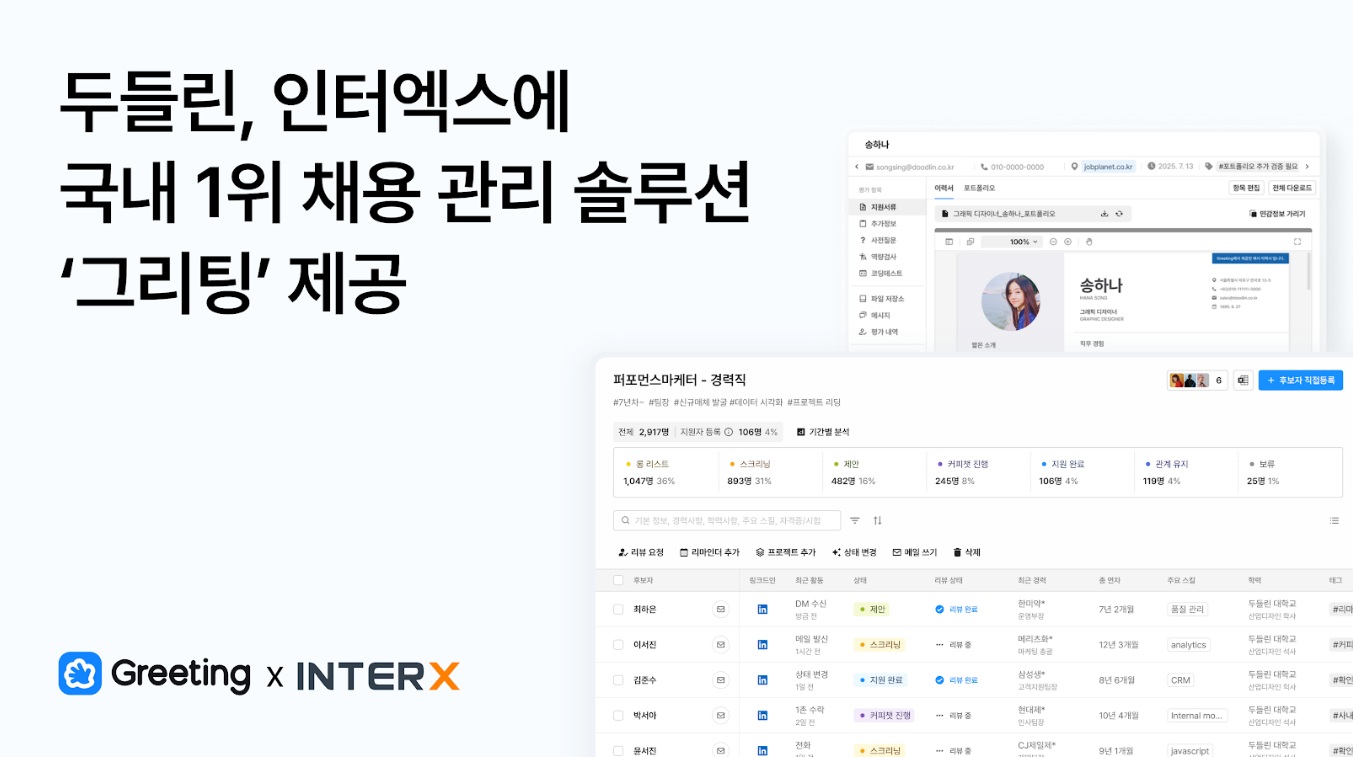 주식회사 두들린(대표 이태규)은 자율제조 전문기업 인터엑스(대표 박정윤)에 채용 관리 솔루션 ‘그리팅’을 제공한다고 11일 밝혔다.