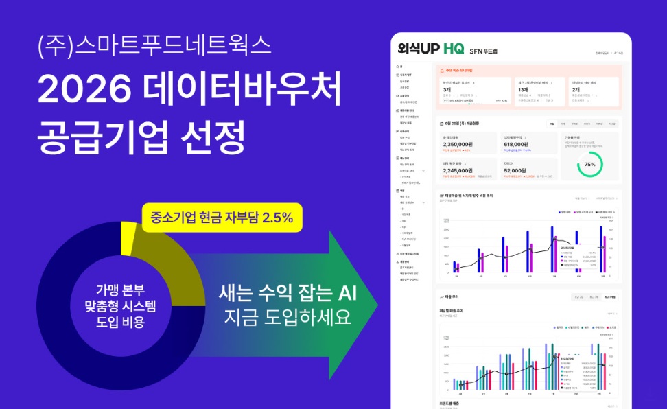 외식업 식자재 유통 및 테크 기업 스마트푸드네트웍스(대표 허정은, 이하 SFN)가 과학기술정보통신부 주관 ‘2026년 데이터바우처 지원사업’ 공급기업으로 선정됐다. SFN은 프랜차이즈 올인원 운영 솔루션 ‘외식UP HQ’를 통해 가맹본부가 데이터 기반의 투명한 경영 시스템을 구축하도록 지원하며, 가맹점과 본사가 함께 성장할 수 있는 상생 경영을 추진한다.