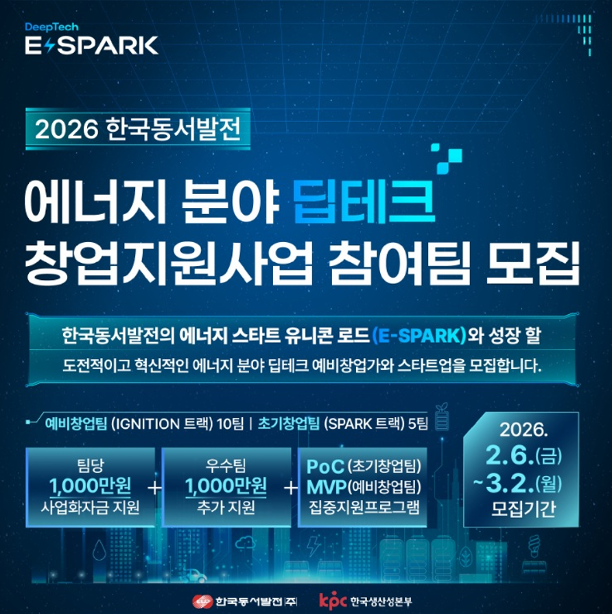 Korea East-West Power Co., Ltd. is recruiting teams for its "2026 Energy Deep Tech Startup Support Project (E-SPARK)" to strengthen the competitiveness of the domestic energy industry and foster promising startups. This program is open to prospective startup teams and early-stage startups with less than three years of experience nationwide.