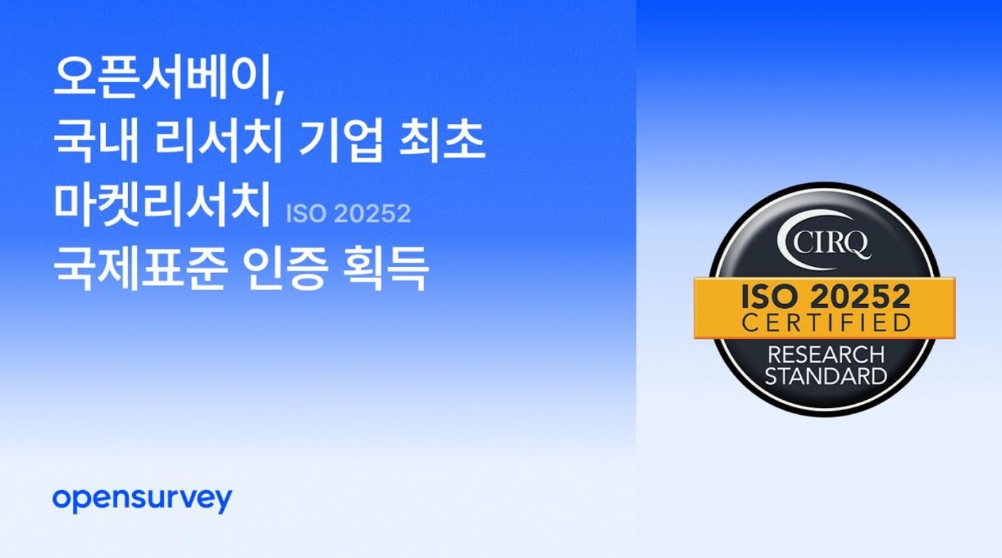 ISO 20252는 국제표준화기구가 마켓리서치, 사회조사, 오피니언조사 분야에 특화해 제정한 국제표준이다. 이번 인증을 통해 오픈서베이의 연구 프로세스 관리 시스템은 다양한 산업군과 고객 과제에 유연하게 대응할 수 있는 설계와 운영 체계를 갖췄다는 평가를 받았다.