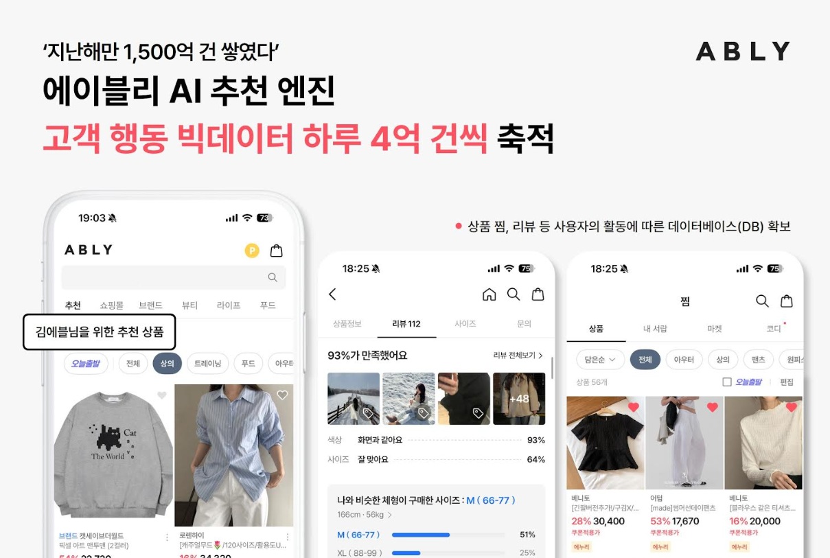 顧客行動ビッグデータとは、商品露出、クリック、蒸し、カートに入れる、注文など、利用者のショッピング行動を記録したデータベース(DB)を意味する。 Ableyはアプリ内で発生するすべての行動データをユーザーID別にラベル付けし、連続したデータセットでリアルタイムに蓄積している。クリックしない、または購入につながらない行動まで、好み情報として含めることが特徴である。