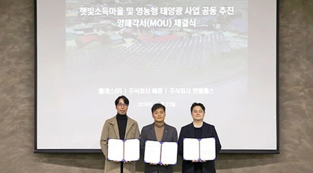 栄農型太陽光専門企業クレス、エネルギーIT企業ハズム、岐阜テック企業エンベロップスは、韓国の日光所得村および栄農型太陽光(APV)事業拡大のために「スマートAPVアライアンス」を結成して業務協約(MOU)を締結したと24日明らかにした。