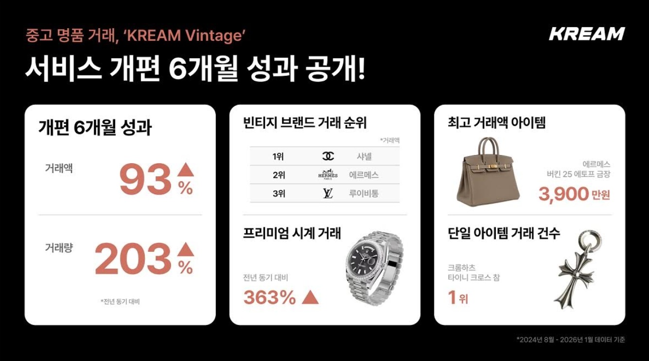 KREAM (CEO Kim Chang-wook), a limited edition trading platform, has released six months of transaction data for its used luxury goods trading service, "Vintage." Renovated in August of last year, Vintage expanded its brand lineup and improved user accessibility, resulting in a sharp increase in both transaction volume and transaction value.