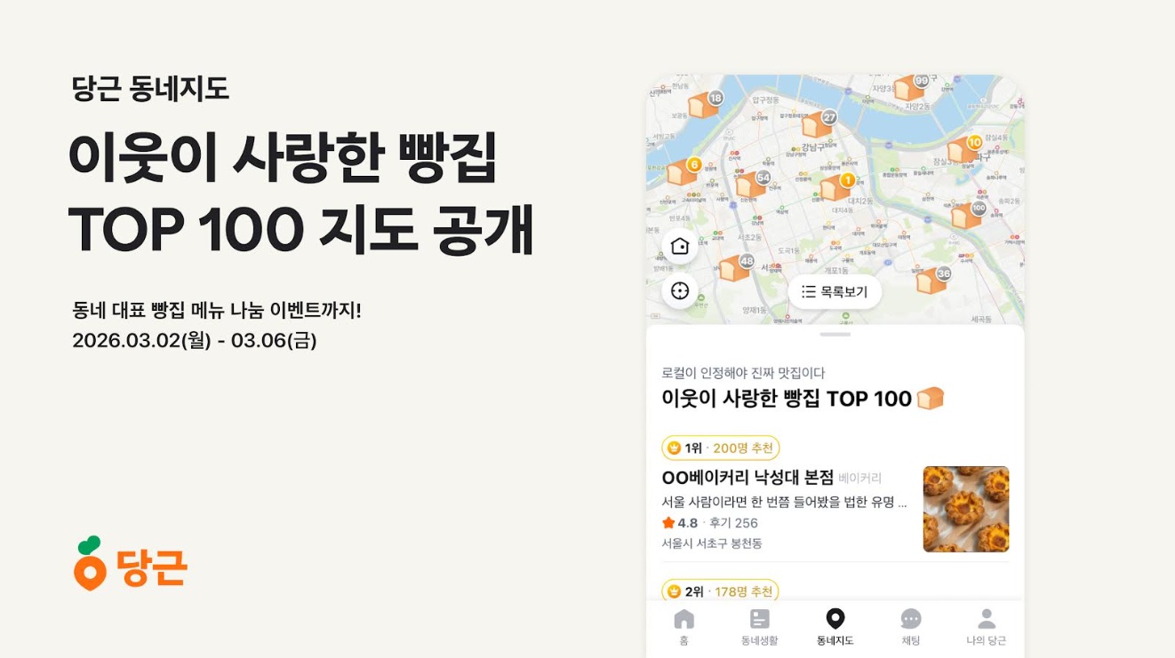 이번 리스트는 동네 주민들의 실제 방문 경험과 자발적인 후기 데이터를 기반으로 선정된 로컬 빵집 지도다. 단순한 유명 맛집이 아닌, 이웃 추천을 중심으로 구성된 점이 특징이다. 해당 목록은 3월 22일까지 당근 앱 내 동네지도 탭에서 확인할 수 있다.