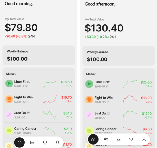 주식 투자 개념을 조직문화에 적용한 게 컬처 마켓이에요. 핵심가치를 주식처럼 상장하고, 동료의 좋은 행동에 ‘매수’ 버튼을 누르고, 주가가 오르내리는 걸 지켜보면서 조직의 건강 상태를 진단합니다. 즉 라이너 컬처 마켓은 말 그대로 문화의 주식 시장이에요. 5가지 핵심가치를 각각 10달러에 ‘상장’했습니다. 실제 앱으로 구현했고, 팀원 모두가 사용합니다. 어떻게 작동하는지 설명해드릴게요.
