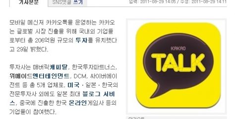 스마트폰용 무료 메신저 애플리케이션인 카카오톡이 200여 억원 규모의 투자를 유치했다는 기사 (2011.08.29)가 올라왔었다. 만약 200억원에 대한 지분율이 10%라고 한다면 카카오톡의 기업 가치는 2,000억원 수준으로 계산하여 투자받았다고 할 수 있다. 2,000억원의 10%가 200억원이기 때문이다. 그런데 보통 투자금액은 기사에 나오는데 지분율이 나오지 않는 경우에는 회사 가치를 얼마로 산정했는지 알기가 어렵다. 회사가 상장되어 있거나 자산 규모가 일정 수준 이상인 회사들의 경우 공시 의무가 있기 때문에 이를 통해 관련 내용을 알 수 있다. 회사를 인수한 곳이 이에 해당된다면 이 회사의 공시 내용을 살펴보면 몇 퍼센트의 지분을 얼마에 인수했는지 나와있기 때문이다. 이런 내용을 보려면 금융감독원에서 운영하는 전자공시시스템에 가보면 된다. 전자공시시스템은 우리나라 주요 기업들의 사업 현황을 들여다볼 수 있기 때문에 유용하게 이용할 부분이 많다. 스타트업 CEO들이 가장 관심있어 하는 것은 카카오톡의 기업 가치를 어떻게 계산했는가 하는 것일 것이다. 회사에 투자할 투자자가 있어서 투자를 받는다고 할 때 해당 투자금에 해당하는 지분을 어떻게 정해야 할 지 결정하기가 쉽지 않기 때문이다. 이런 방법을 배운 적도 없고, 주위에 물어봐도 딱히 명확한 답변을 주는 사람도 없다. 초기 단계로 지출만 있고 매출이 없는데 어떻게 기업 가치를 측정할 수 있을까?결론부터 말하면 ‘기업 가치를 수학 공식처럼 측정할 수 있는 방법은 없다’이다. 그러니 마음을 편하게 갖자. 대개의 경우 투자자와 창업자가 서로 납득할 수 있는 기준을 가지고 합의해 나가는 것이 일반적이다. 그럼 여기서 '서로 납득할 수 있는 기준'에 해당하는 기준이 무엇인지 궁금해 진다. 투자를 받을 때 결정되야 할 것은 현시점에서 필요한 투자 금액과 현재의 기업 가치 가 될 것이다. 필요한 투자금액이 1억원이고, 현재의 기업 가치가 9억원이라고 하자. 투자금 1억원이 집행되면 기업 가치는 10억원이 될 것이다. 그러면 1억원에 대한 지분율은 10%가 되는 것이다. 투자금액에 대한 지분율은 간단하다. 그러면 현재의 기업 가치 산정 방법을 알아야 한다. 기업 가치는 보통 자산가치, 수익가치, 시장가치로 나눌 수 있다. 자산가치란 말그대로 현 시점에서 기업이 가지고 있는 자산에 대한 가치다. 가지고 있는 돈 될 만한 모든 것에서 갚을 돈을 뺀 것이라고 하면 이해가 쉬울 것이다. 그런데 문닫은 기업에 대한 가치 평가가 아니라면 영업 활동에 대한 가치를 산정해야 한다. 이것을 수익가치라고 한다. 수익 가치란 매년 벌어들이는 수익을 현재화시키는 것이다. 자산가치와 수익가치를 일정 비율로 섞어서 평가하기도 한다. 시장가치는 증시에 상장된 기업의 발행 주식수에 현재 주가를 곱해서 나오는 시가총액이나 유사 기업과의 비교 등을 통해 측정할 수 있다. [caption id="" align="aligncenter" width="519" caption="기업가치평가방법 http://gojump0713.blog.me/140126606899"][/caption]스타트업 기업은 복잡한 방식을 이용해서 계산할 필요는 없을 것이다. 미래 예상 수익에 대해 공감대를 이루는 것이 가장 중요하다. 현재 자본금이 1억원이고 미래 예상 순이익이 아래와 같은 A기업이 있다고 치자.장부가치와 미래현금할인가치가장 기본적인 방법은 장부가치와 현금흐름할인을 조합하는 방법이다. 즉, 현 시점에서의 재산과 미래에 유입될 현금을 현재화 시켜서 계산하는 것이다. 현재 가치로 바꿀 때는 적당한 할인율을 적용하면 된다. 할인율을 6%라고 하고 4년간 미래현금흐름을 현재가치로 바꾼다면 1/(1+0.06)+5/(1+0.06)^2+10/(1+0.06)^3+20/(1+0.06)^4 로 계산해 볼 수 있다. 이렇게 계산하면 29억 6,300만원이 나온다. A기업의 재무제표에 적힌 자산 중 부채를 제외한 장부가치가 10억원이라면 이 회사의 기업 가치는 39억 6,300만원이라고 할 수 있을 것이다. 미래 현금 흐름을 4년치로 할 지, 5년 치로 할 지는 따로 정해야 할 것이고, 미래에 이 정도 수익을 낼 수 있을 지에 대해 서로 이해하는 게 중요하다고 할 수 있겠다. 주가수익율 방식또 다른 방법은 주가수익율 방식이다. 이 방식이 단순 계산하기에는 가장 쉬운 방법이 될 것이다.주가수익율(PER;Price Earning Ratio, 이하 PER)이란 해당 기업의 주가를 주당순이익으로 나눈 값이다. A 기업은 자본금이 1억이고, 1년차 예상순이익이 1억이다. 이 기업 주식 액면가가 500원이라면 발행주식수는 200,000주일 것이다. 이 때 나온 순이익 1억원을 200,000주로 나누면 주당 순이익은 500원이 된다. 한 주를 투자했을 때 얻을 수 있는 순이익이 500원인 것이다. 주당 순이익이 500원이 기업의 주식을 5,000원에 투자한다면 주가수익율, PER는 10이 되는 것이다. 어떤 투자자는 5,000원이 적당하다고 생각할 것이고, 어떤 투자자는 2년차에는 5억원의 수익을 올릴 것이라 믿으므로 한 주를 20,000원이라도 사겠다고 할 것이다. 또 다른 투자자는 2년차 5억원의 수익은 말이 안 된다고 생각하며 지금 5,000원에도 투자하지 않을 것이라고 할 것이다. 미래 기대 수익율을 고려하여 현 주가가 결정될 것이다.역으로 생각해서 PER가 10이라고 하면 투자대비 10
