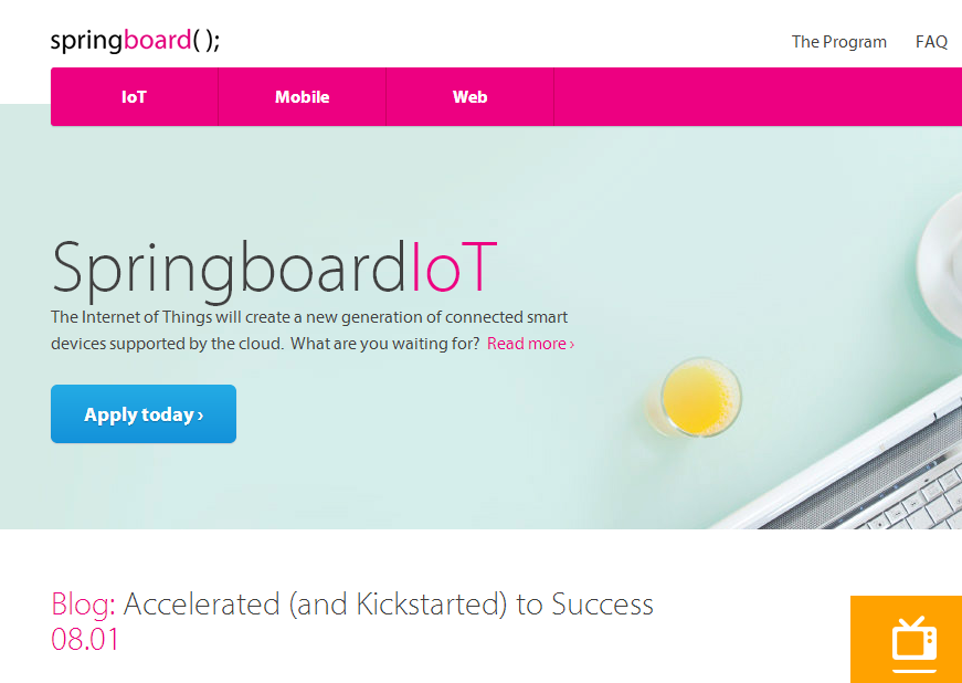 Springboard Internet of Things IoT is an accelerator program that accepts the ten best teams in any area of IoT technology, from bright idea to Series A funding. Participating founders will receive more than $150,000 of free services, seed capital and mentoring from more than 100 industry leaders around the world, in an intensive three-month bootcamp.