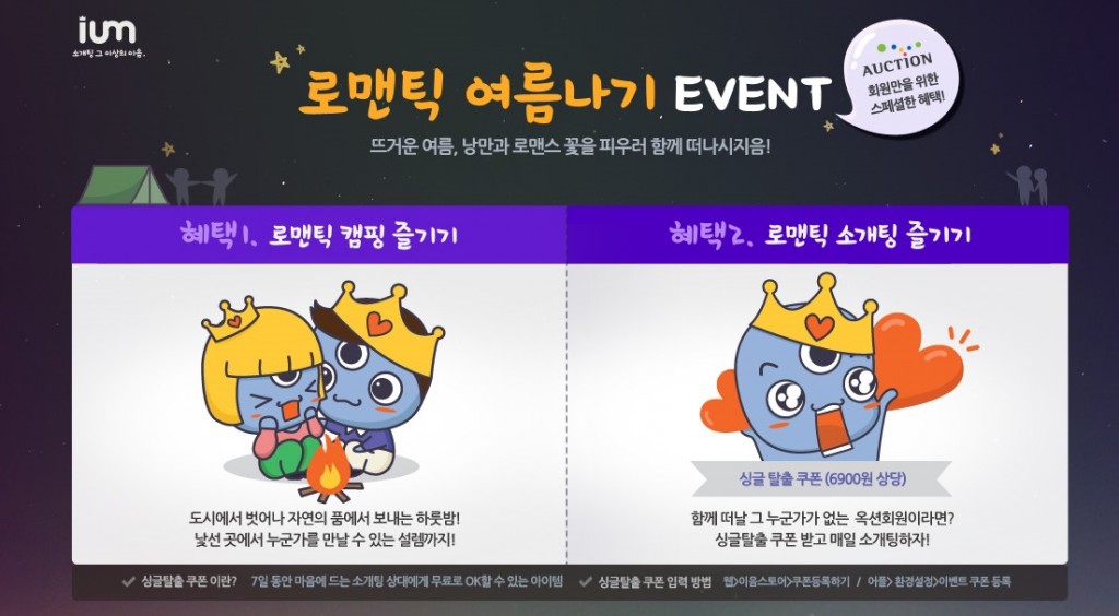 No.1 소셜데이팅 이음(www.i-um.com, 대표 박희은)과 온라인마켓플레이스 옥션(www.auction.co.kr)이 여름을 맞이해 특별한 캠핑을 준비했다. 내달 17일(토)부터 18일(일)까지 1박 2일간 양평 서종문화체육공원에서 ‘싱글캠핑’을 개최하기로 한 것이다.
