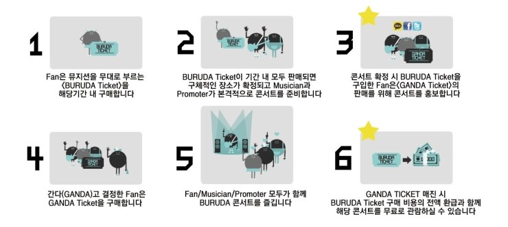 부루다콘서트의 부루다티켓을 구매하는 사람들은 그 뮤지션의 코어 팬이라고 생각한다. 유명하지 않은 뮤지션일지라도 ‘우리오빠’의 콘서트를 직접 만들어 내고 싶어하는 니즈를 가진 사람들이다. 어떤 의미에서는 팬이 그 뮤지션에게 주는 선물이 될 수 도 있을 것이다. 팬이 직접 가수의 콘서트를 만들어 나간다는 것 자체에 큰 의미가 있다고 본다. 팬이 부루다티켓을 구매하면서 ‘투자자’가 되고, 간다티켓을 매진 시키기 위해서 자발적인 홍보를 통해 ‘마케터’가 된다. 간다티켓 매진을 통해서 금전적인 리워드 혜택까지도 받을 수 있다. 또, 부루다콘서트는 부루다티켓 구매자와 뮤지션을 네이버 ‘밴드’서비스를 이용하여 한 커뮤니티에 묶어준다. 이를 통해 서로가 의견을 나누고 교감할 수 있는 재미도 있다. 부루다콘서트로 인해 팬과 뮤지션의 관계에서 높낮이가 있는 것이 아닌, 그 둘이 함께 만들어 나가는 새로운 공연문화가 열릴 것이라 기대한다.