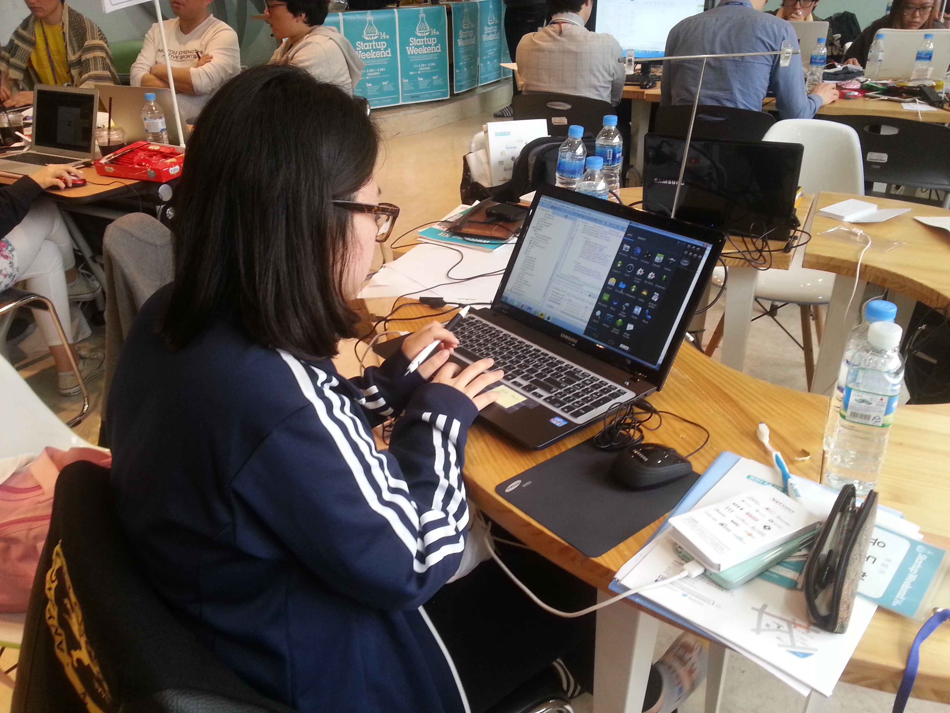 주말 내내 씻지도 못한 채로 스타트업 위크엔드에 참가하고 있는 유도희 양은 표정이 밝다. 그녀는 개발자로 스타트업 위크엔드에 참가했다. “대체 왜 주말까지 반납해가며 이 행사에 참여했나요?”라는 질문에 그녀는 “새로운 경험을 위해서요.”라고 답한다. 그녀의 전공은 디지털미디어학과로, Java나 Android와 같은 C언어를 많이 접해볼 수 있는 곳이다. 그런 그녀가 굳이 스타트업 위크엔드에 참여한 것은 바로 개발자가 아닌 다른 사람들과 프로젝트를 진행해보기 위해서이다. 그녀는 전공 수업을 들으면서 학과생들과 프로젝트를 진행해본 적이 많다. 하지만 기획자나 디자이너처럼 비개발자들과 함께 프로젝트를 진행해본 적은 이번이 처음이다.