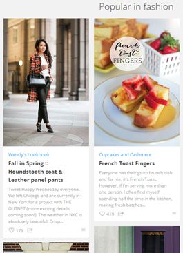 - 카테고리별 테마 검색:홈페이지에서 예술, 패션, 디자인, 영상, 엔터테인먼트 등 다양한 카테고리에 해당하는 블로그 콘텐츠 검색이 가능. Bloglovin 사용자에게 인기가 있는 블로그 콘텐츠가 노출되며, ‘좋아요’ 수를 통해 인기 정도를 확인 가능(하기 이미지는 모두 Bloglovin 웹사이트)