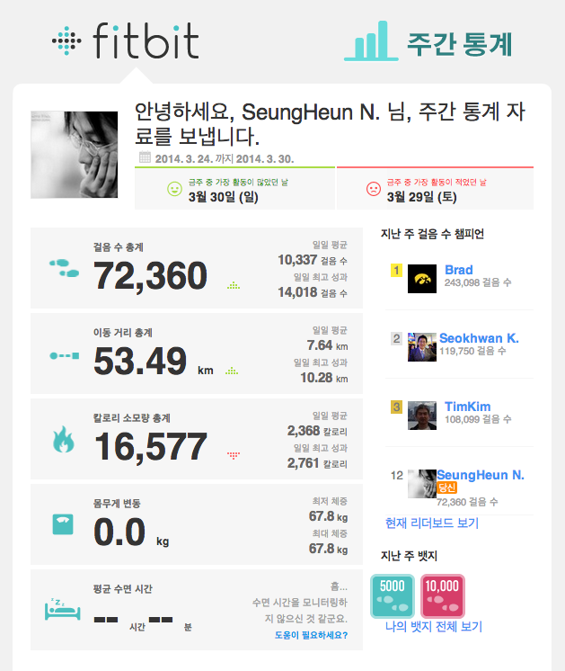 핏빗을 이용하여 기기 및 사용자 등록을 마치면 주기적으로 운동 리포트를 이메일을 통해 전달해 줍니다. 물론 웹 사이트를 통해서 언제든 통계를 확인할 수 있고 스마트 폰의 앱을 이용해서도 확인이 가능하지만 마치 헬스클럽의 트레이너가 주기적으로 운동에 대한 강도를 높이라는 압박을 하는 것처럼 이메일을 통해 동기부여를 해주고 있는 것이죠. 지난주에 도착했던 제 리포트를 살펴보면 역시 조금 더 걷고, 뛰고, 달려야 한다는 생각이 들게합니다.