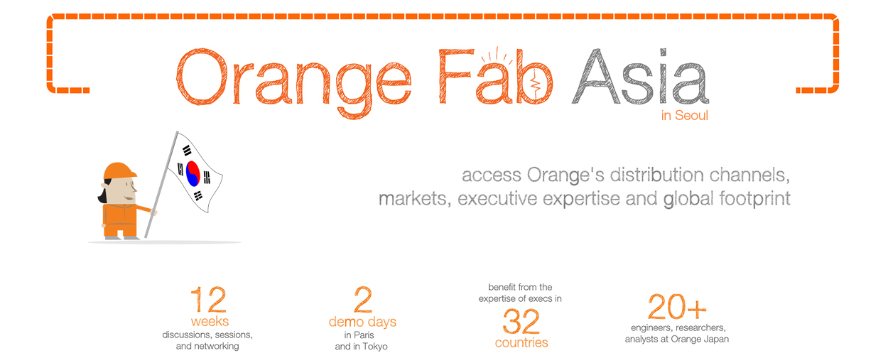 오렌지팹(Orange Fab)은 오렌지(Orange) 가입자들에게 제공 가능한 제품이나 서비스를 가지고 있는 초기 스타트업들의 글로벌 시장 진출을 돕는다. 현재 도쿄에서 진행중인 1차 프로그램에서는 8개의 스타트업들이 선정되었으며, 5월(도쿄)과 6월(파리)에 있을 데모데이를 준비중이다.