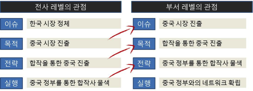 예컨대 우리 회사를 한국의 건설 회사라고 가정해 보자. 그리고 우리 회사의CEO는 우리가 중국 시장에 진출해야 한다고 하면서 전략기획부서에게 중국 진출 전략을 계발해 보라고 했다. 그 목적은 한국 시장은 점차로 성장이 정체되고 있는데, 중국 시장은 엄청난 속도로 성장이 이루어지고 있고, 앞으로의 잠재력도 크기 때문이다. 전략 기획 부서의 부장님은 중국 진출 전략에 대해서 다양한 고민을 한 끝에 직접 진출, 합작을 통한 진출, 그리고 중국 업체 인수를 통한 진출이라는 세 가지 옵션에 대한 장단점을 분석해 오셨다. 하지만 중국 시장은 외국 업체가 단독으로 진출해서는 큰 성공을 거두기 어렵고, 중국 정부에서의 규제상으로도 중국 업체와의 합작이 최선의 전략이라는 결론이었다. 문제는 지금부터이다. 중국 진출을 위해서 최적의 합작 업체를 찾기가 녹녹치 않다. 이를 위해서는 현지 사정을 잘 아는 중국 전문가들에게 의뢰를 하거나, 컨설팅 용역을 고용해야 할지도 모를 일이다. 그런데 조금 더 조사를 해 보니 중국 건설업에서는 중국의 각 성(省) 정부와 건설업체와의 관계라는 점을 알게 되었다. 그래서 우리 회사는 중국 성 정부들과 네트워크를 수립함으로써 적절한 합작 업체를 모색해 보기로 했다. 만약 이런 상황이라면 회사 레벨의 전략은 합작을 통한 중국 진출일 수 있지만, 이 일을 맡은 부서 레벨의 관점에서는 중국의 지방 정부와의 합작사를 물색하는 것이 전략의 수준으로 올라오고, 그것을 위한 구체적인 실행은 한단계 더 세부 내역으로 내려가게 된다.