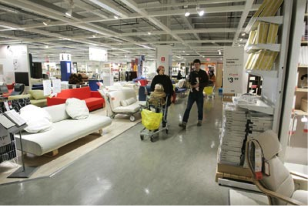 이러한 전략적인 방향성이 원자재 구매에서부터 제품 판매에 이르기까지 모두 달라지게 된다. 원자재는 최대한 저렴한 것으로 구입해야 하고, 제품의 디자인은 단순하고 실용적일 수록 좋다. 정교한 디자인으로 수십년을 쓰는 것 보다는 실용적이지만 다양한 옵션을 제공해서 사람들이 자주 구매하고 자주 교체할 수 있도록 유도하기 위함이다. 그리고 판매 공간도 대형 마트와 같이 카트를 밀고 다니면서 가구를 담을 수 있게 하려면 완성형 가구가 아니라 조립형 가구 형태로 판매를 하는 것이 매장 공간이나 비용 측면에서 유리하다. 그렇다면 가구를 부품상태로 박스에 넣어서 판매하면 된다. 하지만 소비자들은 가구들이 조립된 이후에는 어떤 모습일지에 대해서는 궁금해 할 수 있으므로, 매장 곳곳에 가구가 최종적으로 조립된 형태를 보여주는 쇼룸을 자연스럽게 배치하면 된다는 결론에 이른다.