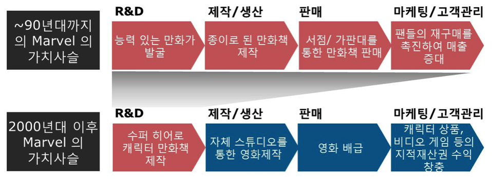 마블 코믹스는 자신들의 역량과 자원을 ‘만화책 출판’이라는 비즈니스로 한정 짓지 않았다. 마블은 자신들이 지금까지 형성해 놓은 캐릭터들과 그 캐릭터를 추종하는 수 많은 팬들을 자신들의 자산이자 역량으로 규정하였고, 이들을 토대로 한 영화 판권 판매와 캐릭터 상품 판매로 사업을 재정의하였다. 그 첫 시작으로 스파이더맨과 같은 캐릭터의 만화를 영화로 제작하는데 있어서 판권을 판매하는 것이었다. 그리고 마블은 이렇게 성공한 영화의 캐릭터에 대한 지적 재산권(intellectual property)를 가지고 다양한 캐릭터 상품 판매와 비디오 게임 등의 판매에 있어서 로열티를 받는 방식으로 수익을 거두었다. 스파이더맨 등 몇몇 캐릭터의 지적 재산권을 활용하여 성공을 통해서 마블은 캐릭터 기반의 영화에 대한 무한한 가능성을 보게 되었고, 급기야 2000년대 중반부터는 자신들만의 영화 스튜디오를 설립하였다. 만화책 회사가 영화를 제작하기로 결정하기까지는 불과 10년도 걸리지 않았는데, 이렇게 마블이 혁신적으로 변할 수 있었던 이유는 수많은 영화 작업을 대형 영화 스튜디오와 함께 하면서 그들의 영화 제작 노하우를 습득한 후에 내부적으로 역량이 쌓였다고 판단했기 때문이다. 그 이후로 마블 코믹스는 캡틴 아메리카 (우리나라에서는 ‘퍼스트 어벤져’라는 제목으로 개봉), 인크레더블 헐크, 아이언맨 시리즈, 토르 시리즈, X-맨 등의 영화에서 큰 성공을 거두게 되었고, 급기야 2012년에는 캐릭터들을 한 군데 모은 영화 어벤져스 (Avengers)를 개봉하기에 이르렀다.