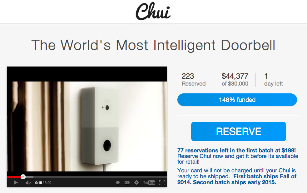 크라우드펀딩을 통해 자금을 모으고 있는 츄이(CHUi)는 한동안 더 많은 진화가 없던 초인종을 한단계 진일보 시키고자 하는 젊은이들의 의지로 만들어지고 있는 스마트 초인종 혹은 인텔리전트 초인종 제품입니다. 츄이는 현재의 화상 카메라가 설치된 초인종이 언제나 사람의 식별을 요구한다는 점에 착안하여 시작된 프로젝트입니다. 동일한 화상 카메라를 이용하지만 소프트웨어를 통해 사용자의 안면인식을 수행하여 친구나 가족이 방문했는지, 헤어진 남자친구가 구질구질한 변명을 늘어놓으려 방문했는지 쉽게 알 수 있습니다.
