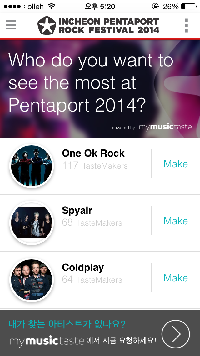 1. JJS 미디어는 MyMusicTaste라는 콘서트 메이킹 플랫폼을 운영하고 있다. 지금까지는 아티스트가 있는 곳으로 팬들이 찾아 갔지만, 이제는 팬들이 모여있는 곳에 아티스트가 찾아간다는 테마로 시작한 서비스이다. 절차로는 My Music Taste 앱에 접속, 좋아하는 아티스트를 선택한다. 그리고 콘서트를 요청할 국가와 도시를 선택한 뒤, 원하는 티켓 금액을 적고, ‘Make!’ 하면 된다. 더 많은 팬이 모이면, 해당 콘서트가 열릴 가능성이 높아진다.