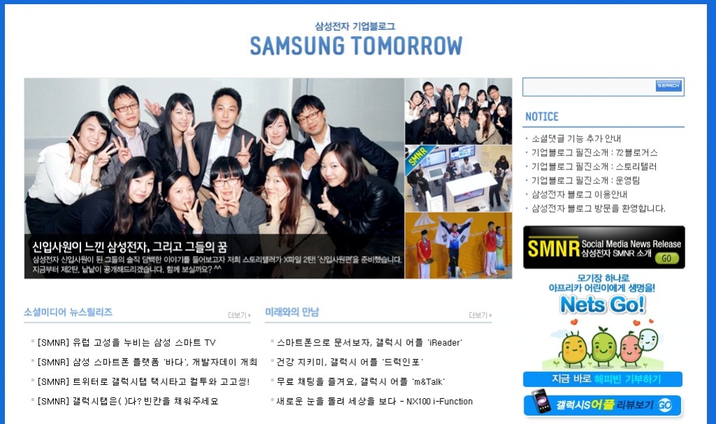 국내 대표기업인 삼성전자는 올해 기업블로그, 트위터, 페이스북등 소셜미디어 채널을 차례대로 오픈하고 고객과의 소통을 강화하는 한편, 기존 홈페이지나 마이크로 브랜드 사이트 등에도 새로이 오픈된 커뮤니케이션 채널을 연계하는 등 다채롭게 미디어 채널을 활용하고 있다. 단순하게 사람들이 모여있는 공간에 채널을 개설하는 것을 넘어서서 기업 블로그의 실질적으로 필요한 취재팀을 운영하거나 적극적으로 제품과 서비스에 관여된 임직원의 소셜미디어 참여를 독려하고 고객과의 양적/질적인 대화를 전개하는 것이 크게 눈에 띄는 점이다.