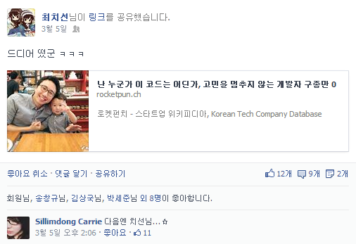정주영: 캐리…는 영어구나…. 아무튼 그럼 상상에 맡긴다. 영어 이름을 쓰기에 상대적으로 다른 회사에 비해 수직적 관계가 덜하고 회의나 게시판에 의견을 개진하는 데도 많은 영향을 주고 있다. 여러모로 카카오는 개발자가 다니기 꽤 매력적인 회사라고 생각한다. 능력이 있으면 그만큼 대우를 해주는 것은 물론이고 개발자의 의견을 생각보다 많이 반영하는 회사다. 지금은 회사 규모도 커지고 직원도 많이 늘어나 어느 정도 성장통이 오는 것 같지만 여전히 자유롭고 괜찮은 회사라고 느낀다.