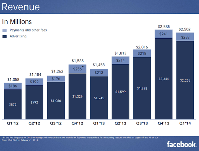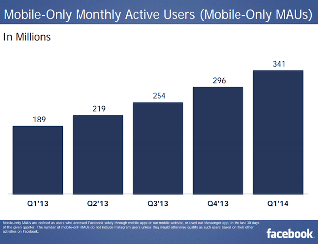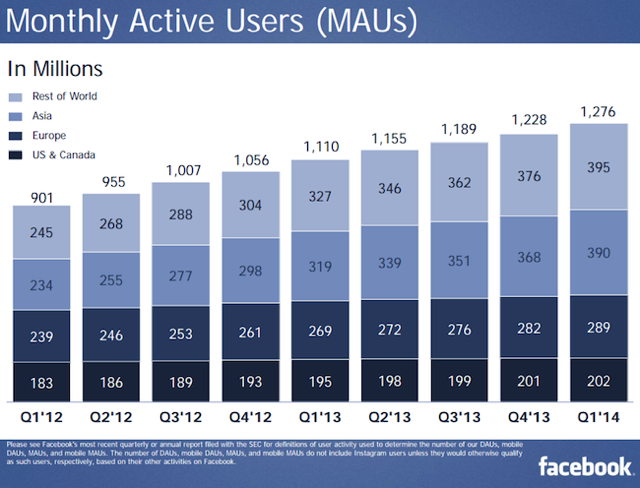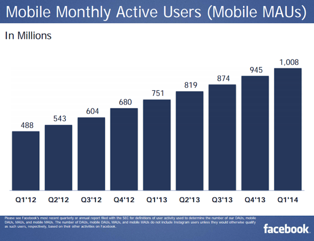 2014년 1분기 페이스북 실적이 발표되었습니다. 월 액티브 유저는 지난해 말에 비해 소폭 증가한 12억7천만명을 넘어섰고, 일 액티브 이용자도 8억명을 돌파했습니다. 즉, 하루에 한번이라도 페이스북 계정으로 페이스북뿐만 아니라 페이스북과 연동된 웹사이트 및 모바일앱에 접속하는 사람이 8억명을 돌파했다는 것입니다.