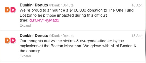 세월호 사건 1년전 미국 보스톤에서는 폭탄 테러 사건이 발생(2013년 4월 15일)한 바 있다. ITWORLD 가 2013년 4월 30일, 보스톤 마라톤 폭탄 테러 사건 이후 공유한 ‘국가적 재난 상황시 기업의 소셜 미디어 대처 방안’ 은 브랜드 담당자들이 참고하기에 좋은 내용들을 담고 있다. 해당 포스트에서 던킨 도너츠 사례가 제시되는데, 간략하게 정리하자면 다음과 같다.