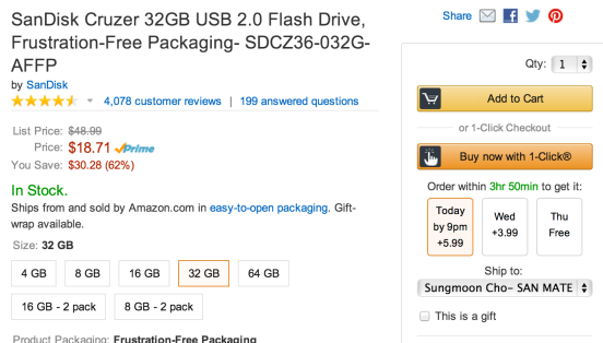 한 번 써보고 나니 편리함을 알게되어 종종 사용하고 있다. 웹에서 주문하면 당일 또는 익일 아침에 배송해주는 서비스이다. 배송비는 따로 5달러가 드는데, 물건 사러 운전해서 갔다가 고르고 계산하고 나서 운전해서 돌아오는데 걸리는 시간을 생각하면 5달러의 값어치가 충분히 있다. 구글 쇼핑 익스프레스는 한동안 샌프란시스코 지역에서만 사용할 수 있었는데 이번주부터 뉴욕과 LA에서도 서비스를 시작했다. 가입하면 10달러를 주며 첫 6개월간은 배송료가 면제된다. 한 친구는 진짜인가 싶어서 99센트짜리 캔디 하나를 사 봤는데 집에 배달해줬다고 했다. 자주 쓰게 되는 타겟(Target), 홀푸드(Whole Foods), 월그린(Walgreen) 등의 물건을 살 수 있는데, 특히 코스트코(Costco)가 포함되어 있어 매우 유용하다. 내일 여기서 산 디시워셔 세제와 키친 타올 등이 도착할 예정이다. 사람이 직접 매장에 가서 물건을 골라 집까지 배달해주는 대가로 5달러는 미국 인건비를 생각했을 때 너무 낮다. 아마도 이베이, 구글과 리테일러들 사이에 계약 관계가 있어서, 매출의 일부를 이베이, 구글에게 돌려주는 게 아닐까 싶은데 아직 증거는 찾지 못했다.