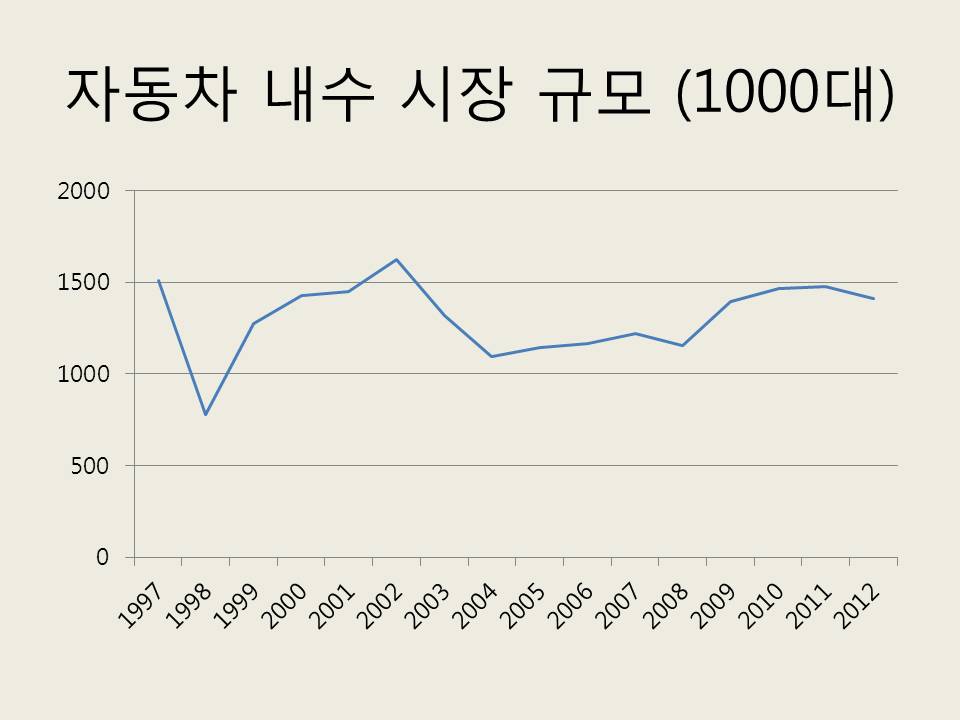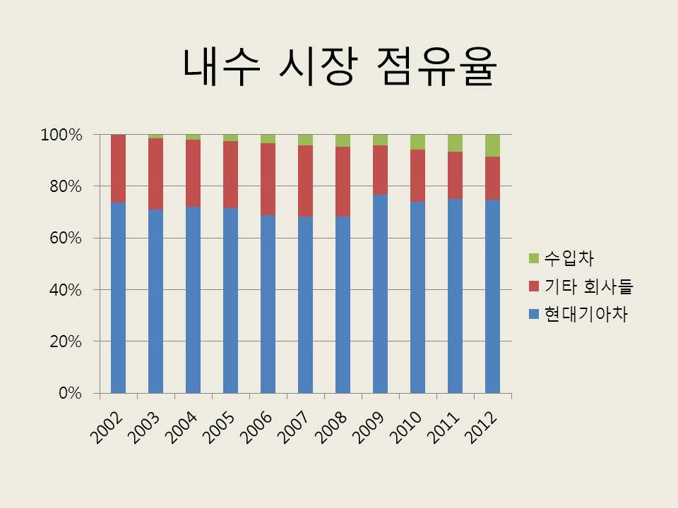 경쟁상황을 보면 우선 눈에 들어오는 시사점은 수입차의 비중이 점차 커지고 있다는 것이다. 2012년 기준 8.5%에 달하고 있으니, 10%를 넘는 것은 시간문제로 보인다. 현대기아차의 점유율은 70-75% 정도를 오가고 있다. 물론 당장 영업과 마케팅을 책임진 임원들 입장에선 1%의 변화도 민감할 수 밖에 없고, 지금 10%도 안되는 수입차의 성장세가 커지면 점유율에 큰 변화가 올 수도 있겠지만, 큰 변화가 일어나고 있는 시장으로 보기는 어렵다.