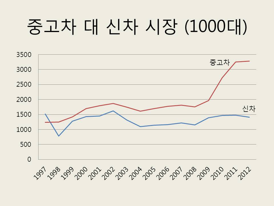 신차 시장만을 보았을 때 보이지 않던 매우 흥미로운 일이 일어나고 있다. 중고차 시장의 규모는 1998년에 이미 신차 시장규모를 넘어섰고, 최근 몇년간 급속도로 성장하여 2012년에는 328만대가 거래되어, 141만대가 거래된 신차시장의 2배를 훨씬 넘는 규모가 되었다. 신차와 중고차를 합한 것을 전체 자동차 시장이라고 한다면, 중고차의 비율이 70%이다.