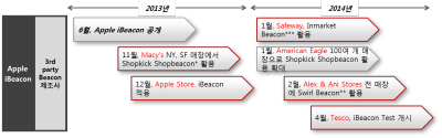 2013년 공개되고 뉴욕메츠 구장에 iBeacon이 시범 적용이 되어 2014년 20개 이상의 구장으로 확대 적용하기로 되었다. 2013년 11월에는 미국의 백화점 체인점인 Macy’s에 Shopkick의 Shopbeacon이 Offline Commerce 매장에 적용된 이후에 12월 Apple Store, 이듬해 1월 Safeway, American Eagle, 2월 Alex & Ani Stores, 4월 Tesco에 활용 또는 시험 중에 있다. 1년도 안된 시점에 필자의 예상 보다 빠르게 iBeacon 생태계가 확장 되고 있다.