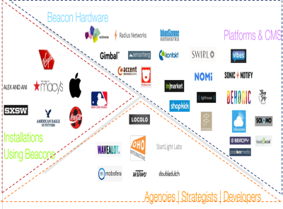iBeacon을 구성하는 생태계는 크게 3개로 Beacon을 1. 매장에 직접 적용하는 브랜드 사업자와 Retailer가 있으며 2. Beacon Hardware 또는 Beacon 기반의 마케팅 플랫폼/Contents Management System을 공급하는 사업자, 3. 브랜드 또는 Retailer 등이 Beacon 지원 서비스를 개발할때 제휴가능한 개발사와 에이전시로 나뉜다. 이미 Offline Commerce 매장에 마케팅, 프로모션 및 로얄티 프로그램을 제공하고 있는 Shopkick, Nomi 등의 사업자들도 iBeacon 진영에 합류했다.