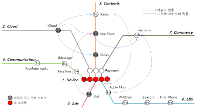 애플의 사업 영역을 Device 제조, Cloud, Contents, Ads, Communication, LBS, Commerce로 나누어 보았다. 애플하면 역시 디바이스 제품의 디자인과 성능을 꼽는 사람이 많듯이 핵심 Device 제품인 iPhone을 비롯해 PC, MP3, Settop Box에 이르기 까지 다양한 제품을 제조해 판매하고 있다.