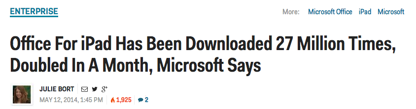 마이크로소프트에게 큰 변화가 진행되고 있습니다. 많은 기업이 그러하듯 언론 보도를 위시한 외부에 알려지는 모습과 내부에서의 모습은 다를 수 있습니다만 적어도 객관적인 정보들이 그들의 변화가 성공적으로 진행되고 있음을 알려주고 있습니다. 마이크로소프트가 지난 3월말 전격 출시한 아이패드용 마이크로소프트 오피스 제품이 누적 다운로드 2700만을 달성했다고 합니다.