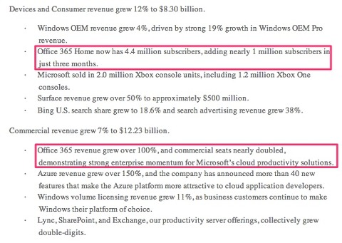 때문에 마이크로소프트 오피스 for 아이패드의 2700만 다운로드는 처음으로 크로스 플랫폼에서 의미있는 숫자가 만들어지고 있다는 점에서 고무적인 결과일 수 밖에 없습니다. 마이크로소프트는 6월에 회계마감을 하기 때문에 회계년도를 기준으로 현재 3분기를 지나 4분기로 접어든 상태입니다. 가장 최근 분기 실적은 3월까지 마감된 3분기였는데요, 이 실적발표 자료에서 오피스 365 관련된 코멘트들을 주목해볼 필요가 있습니다.