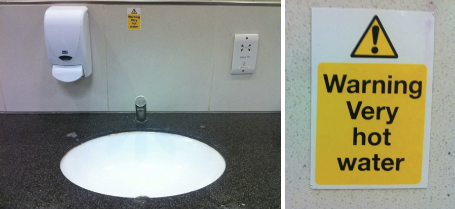 4. 사용자를 배려하지 않는다면 아래 그림처럼 어처구니 없는 UI가 발생할 수도. 온도 조절은 안되게 해놓고 뜨거운 물에 주의 하라고하는 대신 애시당초 뜨거운 물에 화상을 입지 않도록 해야 할일.