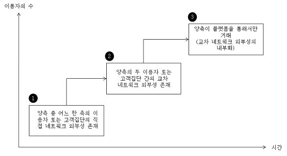 : 3단계는 플랫폼이 완전한 양면시장을 형성하여 양측 고객집단 간의 거래량이 꾸준히 증가하거나 유지되는 단계로, 양측의 고객집단은 높은 거래비용으로 직접 거래가 불가능하기 때문에 계속해서 플랫폼을 이용하여 거래하게 된다.