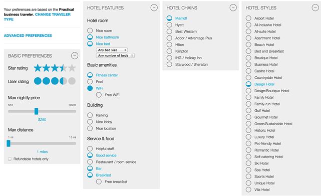 - 프로필 생성:본격적으로 호텔을 예약하기 전에 본인의 프로필을 생성함. 이 과정에서 호텔 선택에 대한 선호도 사항을 선택하게 되며, 선택한 결과는 호텔 추천에 직접적으로 영향을 미치게 됨. 선호도 항목은 호텔 성(Star)급, 사용자 평점, 가격, 호텔 체인, 와이파이, 호텔 스타일 등 다양하며, 상세 항목을 선택할수록 자신에게 더 잘 맞는 호텔을 추천 받을 수 있음. (*하기 이미지는 Olset 웹사이트 참조)