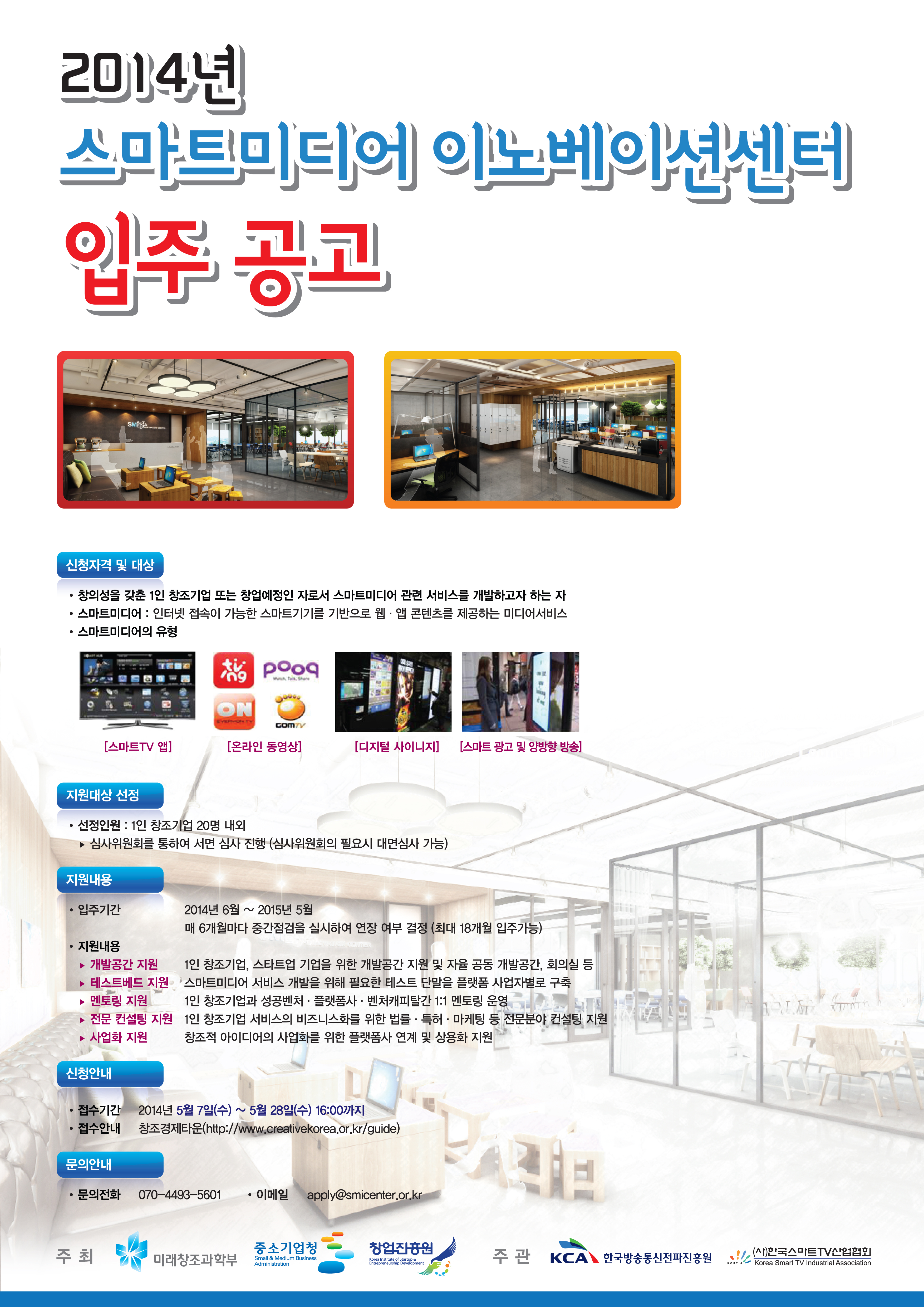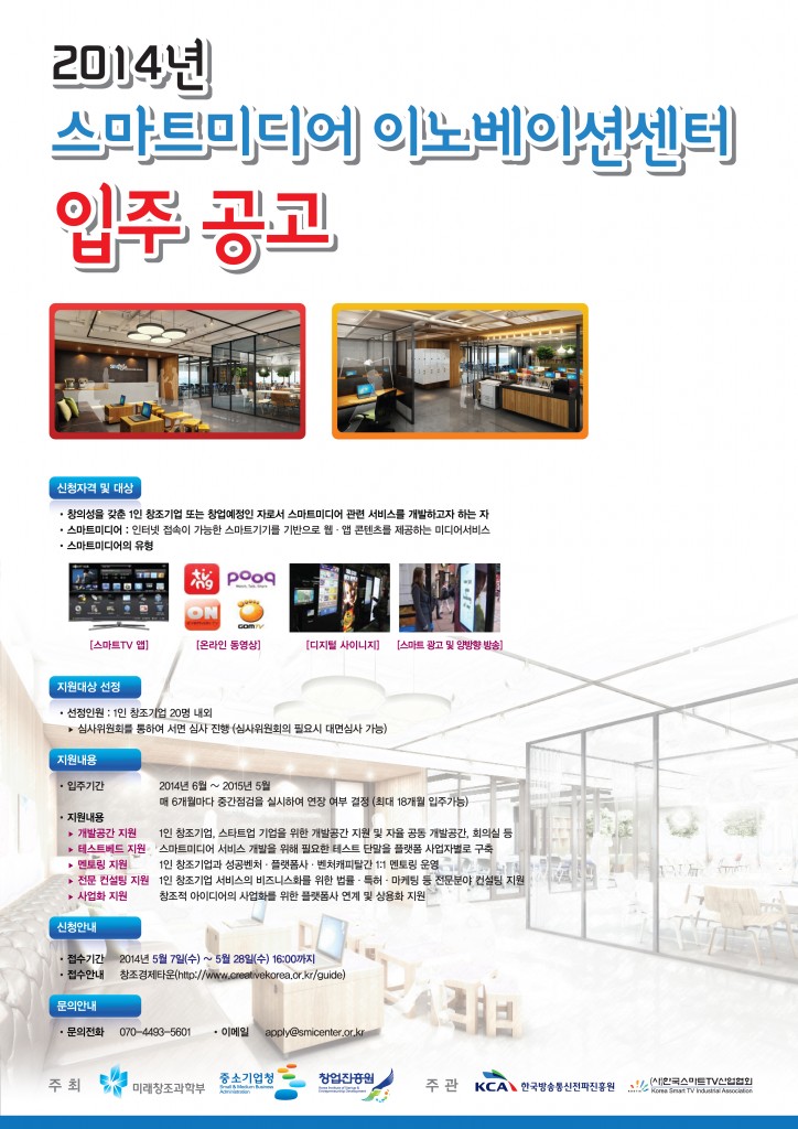 스마트미디어 이노베이션 센터의 입주 기업 모집은 5월 28일까지 진행될 예정이며, 창의성과 전문성을 갖춘 스마트미디어 관련 분야 1인 창조기업이라면 누구나 지원이 가능하다.