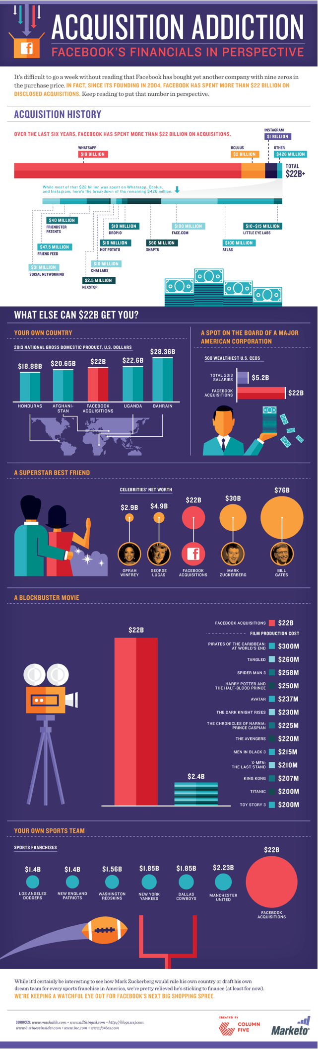 220억 달러는 어느 정도의 돈일까요? 마케토라는 곳에서 흥미로운 인포그래픽을 발표했는데, 220억달러는 온두라스와 아프가니스탄의 GDP보다는 많은 금액이라고 합니다. 자신의 토크쇼에서 깜짝 선물을 주는 것으로 유명한 오프라 윈프리 재산은 약 30억 달러 밖에 안되네요. 제가 좋아하는 프로 스포츠 구단 중 뉴욕 양키스, LA 다저스, 맨체스터 유나이트 등 몇 개 기업의 가치를 모아야 페이스북의 최근 인수액과 비슷하다고 합니다. 왓츠앱 인수가 너무 큰 가격이라 정말 후덜덜합니다.
