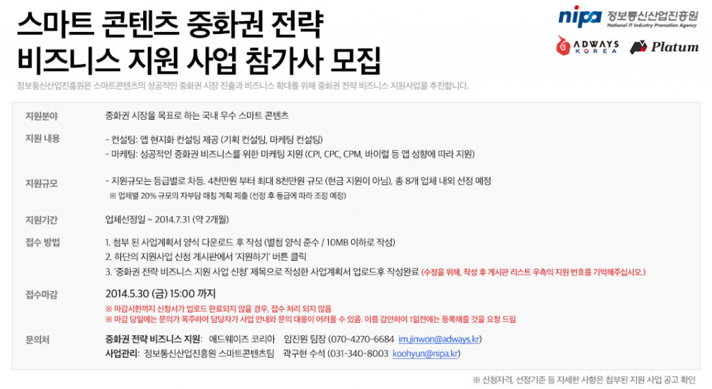 정보통신산업진흥원(이하 NIPA)에서 중화권 시장을 목표로 하는 국내 스마트콘텐츠 스타트업을 선발한다.