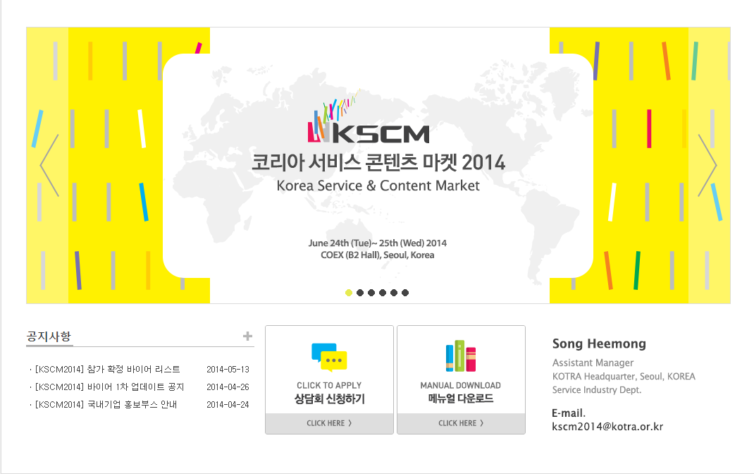 현재 진행되고 있는 지원과정은 1:1 융복합 비즈니스 상담회로, 5월 30일에 마감된다. 신청방법은 kscm.kotra.or.kr 접속, 회원가입을 한 뒤 상담신청을 하면 된다. 가입 후, 바이어 목록 열람하며 상담희망 바이어 우선순위 지정할 수 있다.