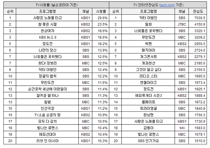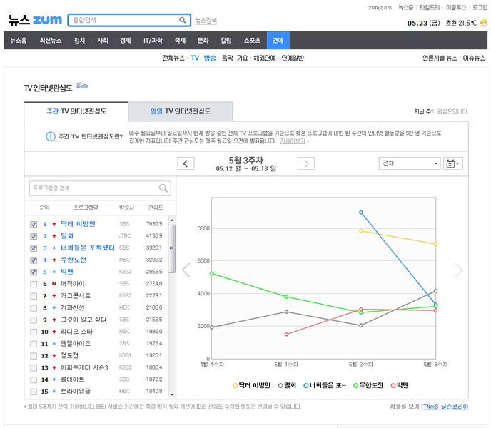 현행 TV시청률 조사 결과와 줌 인터넷의 서비스를 비교해 보면, 상위 20개 방송에서 종편 및 케이블 채널을 찾아볼 수 있다. 줌 인터넷의 TV 인터넷관심도 서비스에 대한 자세한 소개는 홈페이지 (http://inside.zum.com/insideZum/zum/tvtrend)에서 확인할 수 있다.