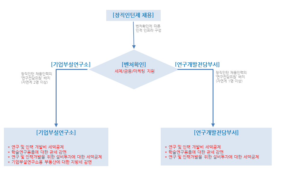 ‘기업부설연구소’의 경우 연구전담요원 2명 이상, ‘연구개발전담부서’의 경우 연구전담요원 1명 이상의 인력을 갖추어야 하는데, 별도로 새로운 인력을 채용하지 않고서도 ‘창직인턴제’를 통해 채용한 인력을 연구전담요원으로 배치하여 활용할 수 있다.