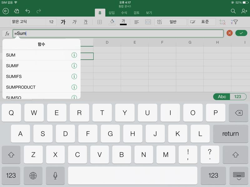 아이패드에서도 사용할 수 있는 기능: 데이터 입력, 셀 서식과 셀 스타일, 일부 차트, 그림삽입, 셀 병합, 셀 삽입 삭제, 행 삽입 삭제, 시트 삽입 삭제, 필터, 함수(수식), 표