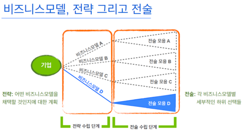 기업이 나아갈 방향과 목표에 따라 다양한 비지니스모델을 만들 수 있다. 즉, 가고자하는 비전과 목표를 이루기위하여 돈을 벌 수 있는 방법은 다양하다는 것이다. 목표와 방향 수립, 산업과 시장분석, 경쟁력 분석과 같은 전략이 비지니스모델에 앞서 고려되어야 한다.