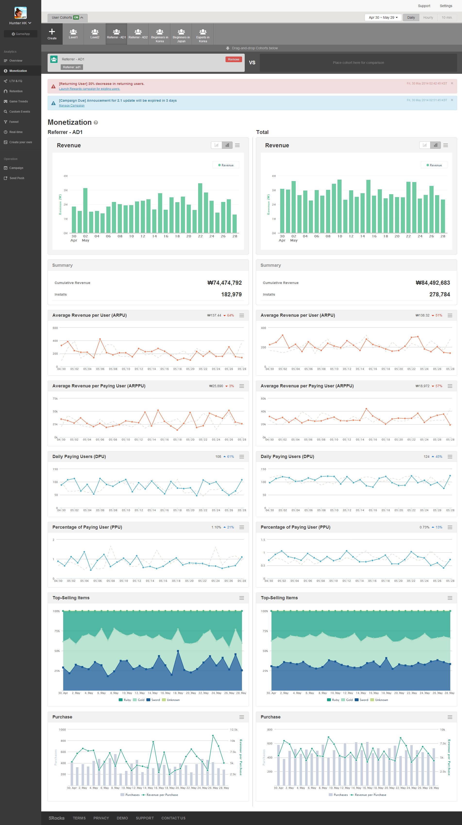 양사는 이미 파이브락스의 모바일 게임 분석 운영 서비스인 파이브락스(5Rocks)와 해스오퍼스의 모바일 광고 트래킹 시스템 ‘모바일 앱 트래킹(Mobile App Tracking, 이하 MAT)의 연동 작업을 마친 상태다. 앞으로 해스오퍼스의 모든 고객사는 추가 작업 없이 파이브락스가 제공하는 유저 분석 기능까지 한 번에 사용할 수 있다. 광고 채널별 효과 측정은 물론 각 채널에서 유입된 사용자를 원하는 조건으로 쪼개어 애플리케이션 이용 행태를 분석할 수 있다는 것이다. 일례로 A 광고 채널을 통해 들어온 유저와 B 광고 채널을 통해 들어온 유저가 주요 아이템 구매나 게임 내에서 하는 행동에서 차이를 보인다면, 개발사는 양쪽 광고 채널에 적합한 서로 다른 마케팅 프로모션을 계획하고 진행할 수 있다.