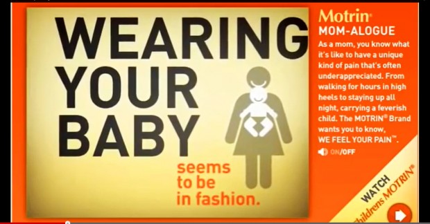 2008년 11월경 미국 유명 제약사 존슨앤존슨의 자회사 중 하나인 맥닐(McNeil)사가 그들 스스로 재미있다고 생각했던 광고 한 편을 온라인에 공개했다. 광고명은 ‘Wear the Baby(아기 안고 다니기)’였다. 그 내용은 대략 어린 아기를 앞이나 옆으로 안고 다니는 많은 엄마가 경험하는 어깨와 허리 등의 통증에 자사의 진통제 모트린(Motrin)이 도움이 될 것이라는 내용이었다.