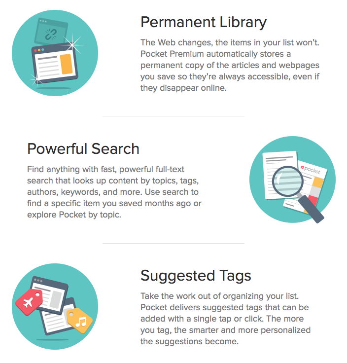 포켓이 새롭게 제공하기 시작한 프리미엄(Premium) 서비스는 그런 니즈를 위한 유료서비스입니다. 월 4.99 달러, 1년 기준으로 50달러가 되지 않는 금액에 제공되는 데이터 영구 저장 서비스가 바로 포켓 프리미엄입니다. 단순히 웹 페이지를 저장해 주는 것이 한달에 5천원 꼴이라면 결코 저렴한 비용은 아니겠지만 저장된 페이지에 대한 풀텍스트(Full-text) 검색과 태깅(Tagging) 기능의 강화로 그 비용의 적절성에 대해 어필하고 있습니다
