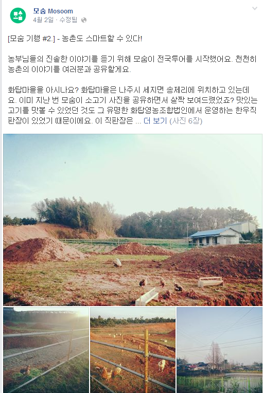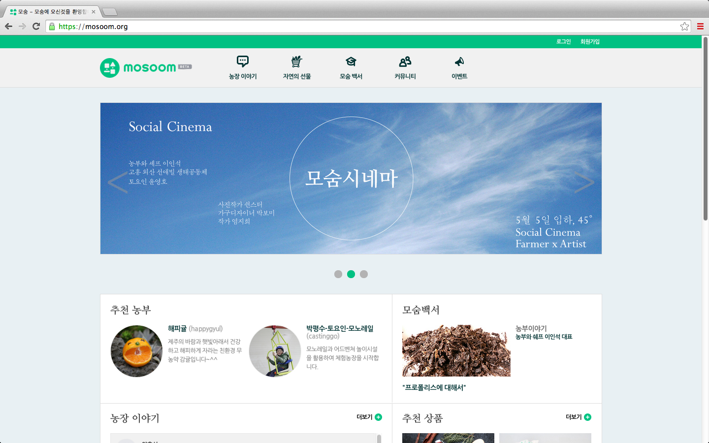 김정욱님이 대답했다. “모숨의 첫 버전은 SNS 페이지였어요. 뭐.. 농부들이 자기 이야기를 올리고 소비자들이 그에 대한 피드백을 통해 소통하는 방식이었죠. 그런데 하다보니까, 문제점을 발견했어요. 농부들과 독자들 사이에 이야깃거리가 충분하지 않았다는 거죠. 예를 들면, 모를 낸다, 어떤 품종이 좋다. 이런 소재는 농부가 아니면 공감이 갈 수 없는 것들이에요. 그래서 공감대를 높이고 양자간의 어색함(?)을 완화하기 위해서 웹진과 컨텐츠를 만들어내기로 했어요. 그래서 포털형으로 페이지를 바꿨죠. 가장 큰 변화는 귀농에 대한 정보입니다. 귀농을 하려고 해도 사실 정보를 모아주는 포털이 없어요. 당연히 정보를 관리해주는 중앙 커뮤니티도 없죠. 정보가 부족하다보니 많은 분들이 주저하게 되고, 요새 귀농 열풍이 분다고 하는데 사실 귀촌이지, 귀농은 아니라고 생각합니다.”