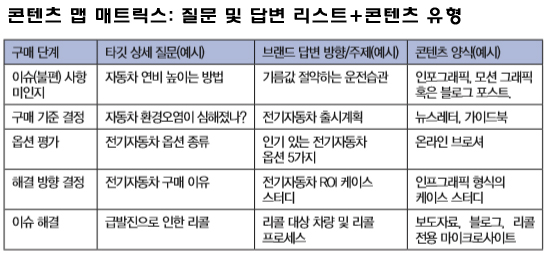 콘텐츠 맵 메트릭스를 작성하면서, 브랜드는 기존에 진행해온 콘텐츠 마케팅 활동을 진단해야 한다. 타겟 공중의 관심에 맞게, 콘텐츠 마케팅 활동을 잘 진행돼 왔는지 매트릭스 작성, 보다 정교하게 파악해야 할 필요가 있다. 콘텐츠 맵 메트릭스 작성 내용은 향후 브랜드에서 추진해야 하는 콘텐츠 전략을 보다 구조화하는데 활용해야 한다.